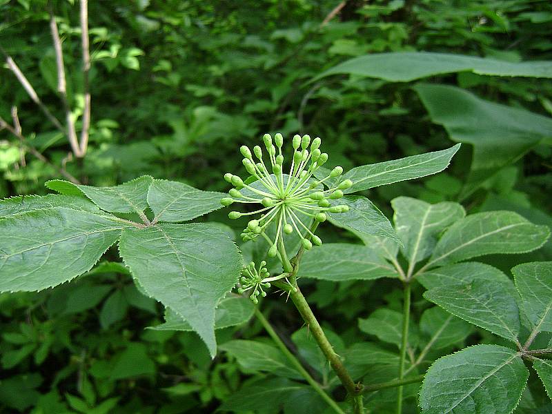 刺五加(拉丁学名:Acanthopanax senticosus (Rupr. Maxim.) Harms),别名:坎拐棒子、老虎潦、一百针。灌木,高1-6米;分枝多。叶有小叶5,稀3;叶柄常疏生细刺,小叶片纸质,椭圆状倒卵形或长圆形,先端渐尖,基部阔楔形,上面粗糙,深绿色,脉上有粗毛,下面淡绿色,脉上有短柔毛,边缘有锐利重锯齿;小叶柄有棕色短柔毛。伞形花序单个顶生,有花多数;总花梗无毛,花梗无毛或基部略有毛;花紫黄色;萼无毛;花瓣卵形;子房5室,花柱全部合生成柱状。果实球形或卵球形。花期6-7月,果期8-10月。